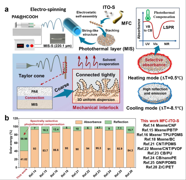 中國科學院寧波材料技術(shù)與工程研究所此前圍繞纖維素基功能材料開展了研究。近日,研究團隊設(shè)計了光譜選擇性光熱補償策略:基于微纖化纖維素特有的一維形貌和高中紅外發(fā)射率本質(zhì),以及納米氧化銦錫(ITO)擁有的光譜選擇性光熱轉(zhuǎn)化能力,通過靜電自組裝得到三維均勻分散的微纖化纖維素(MFC)/納米ITO復(fù)合體(MIS),進而通過原位靜電紡絲,將聚己內(nèi)酰胺冷卻層結(jié)合在串狀納米ITO/MFC光熱層基底上,制備出MIS-S膜。該材料在加熱模式下,展現(xiàn)出特殊的選擇性光熱補償,有助于將內(nèi)環(huán)境溫度提高0.5℃,并能夠防止過熱。在冷卻模式下,該材料也實現(xiàn)了8.1 ℃的降溫效果。