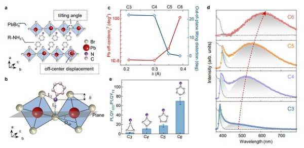 研究團隊創(chuàng)新性地選取了一系列具有相同結(jié)構(gòu)類型、不同環(huán)尺寸環(huán)狀有機陽離子的二維溴化鉛鈣鈦礦作為研究對象,通過精準(zhǔn)調(diào)控有機陽離子的空間位阻效應(yīng),系統(tǒng)探究結(jié)構(gòu)畸變對發(fā)光性能的影響。研究發(fā)現(xiàn),隨著環(huán)狀有機陽離子環(huán)尺寸的增大,由于電子—聲子耦合強度的增強,自陷激子發(fā)射強度顯著提高。