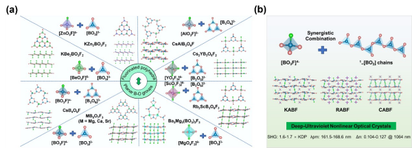 中國(guó)科學(xué)院新疆理化技術(shù)研究所研究團(tuán)隊(duì)提出,氟化多面體與平面B-O基團(tuán)協(xié)同組裝的結(jié)構(gòu)設(shè)計(jì)策略。研究利用氟化多面體的“剪切”效應(yīng)和定向聚合能力,實(shí)現(xiàn)π共軛功能單元的一致排列,成功合成系列堿金屬氟化硼酸鹽晶體KABF、RABF和CABF。